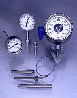 Zeiger und Fernthermometer mit gasgefülltem Meßsystem, 100 und 160 mm Durchmesser, Schutzart IP 54/ IP 65. Andere Gehäusemessungen auf Anfrage. Temperaturbereich von -200 bis +600°C. Optional mit Grenzsignalgeber, mit Schaltverstärker(Relais), mit Schutzhülsen nach DIN 16179 oder z.B. nach DIN 43763, in allen gängigen Materialien.